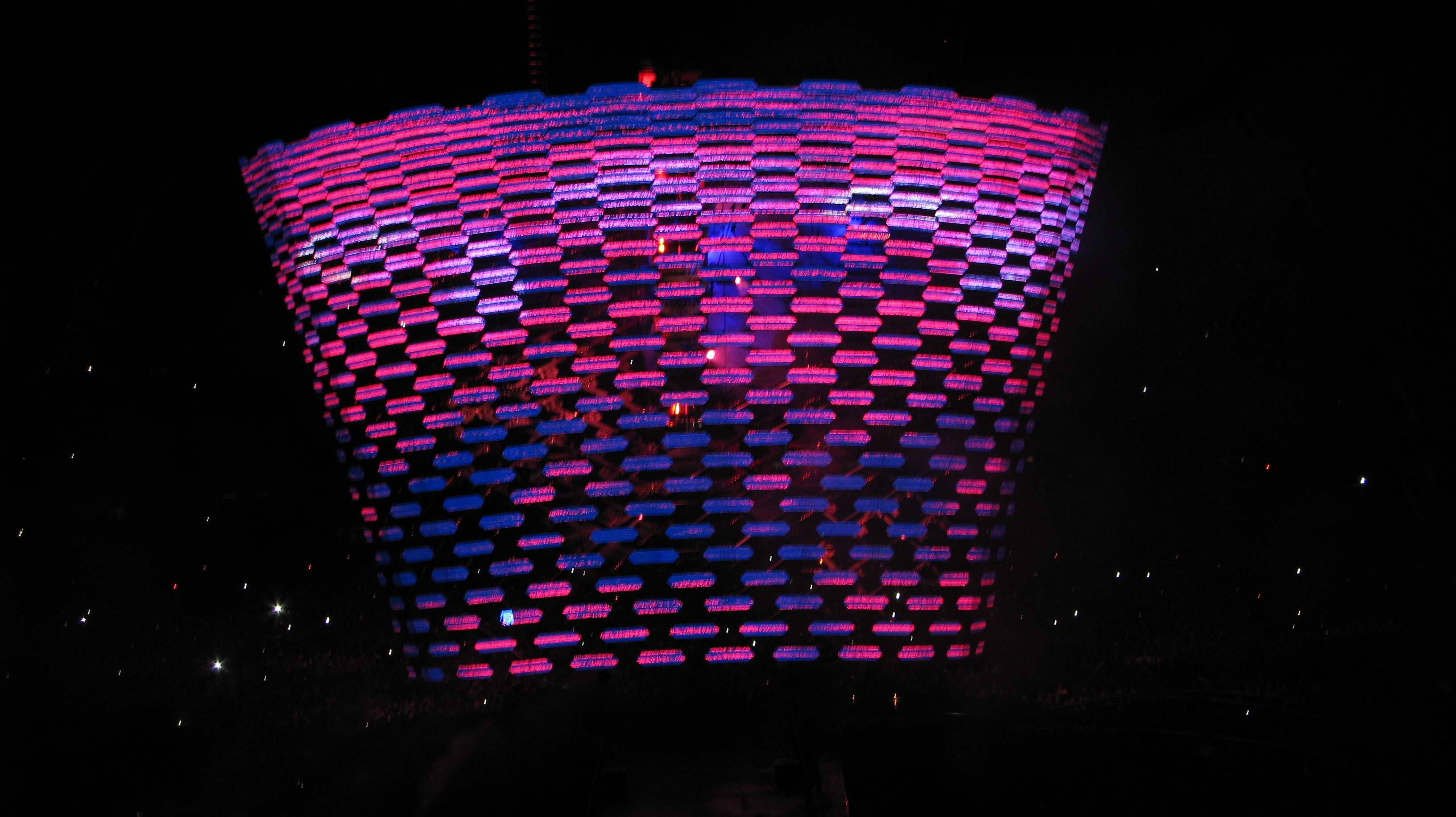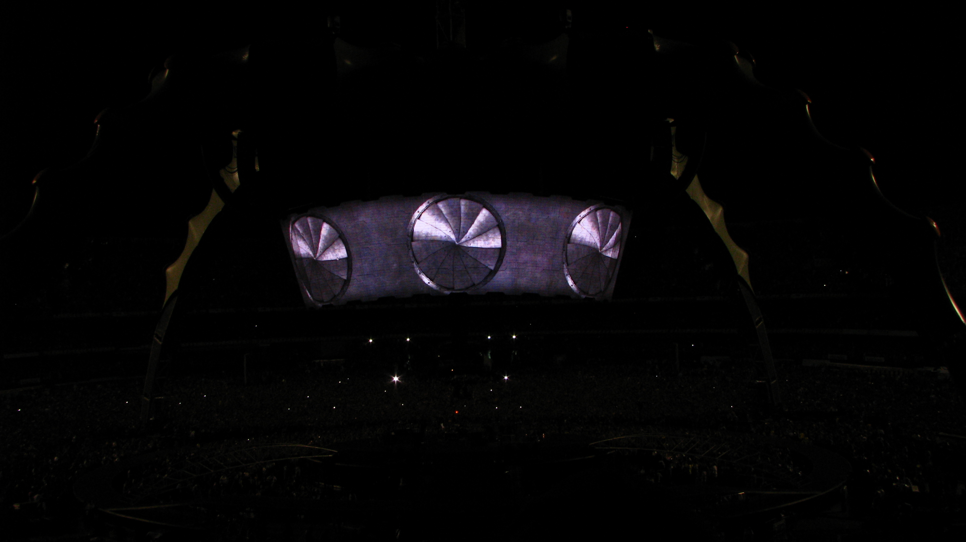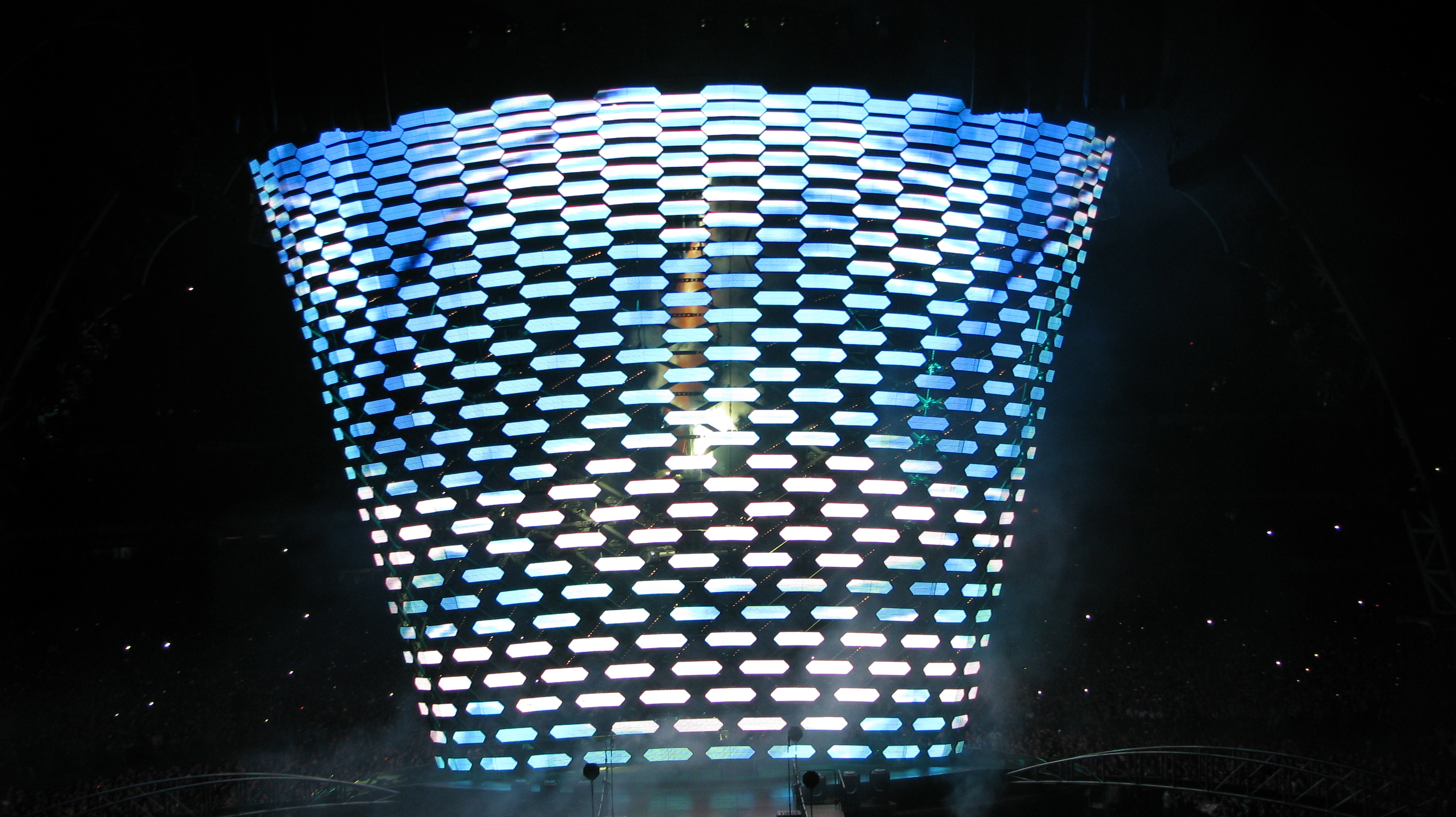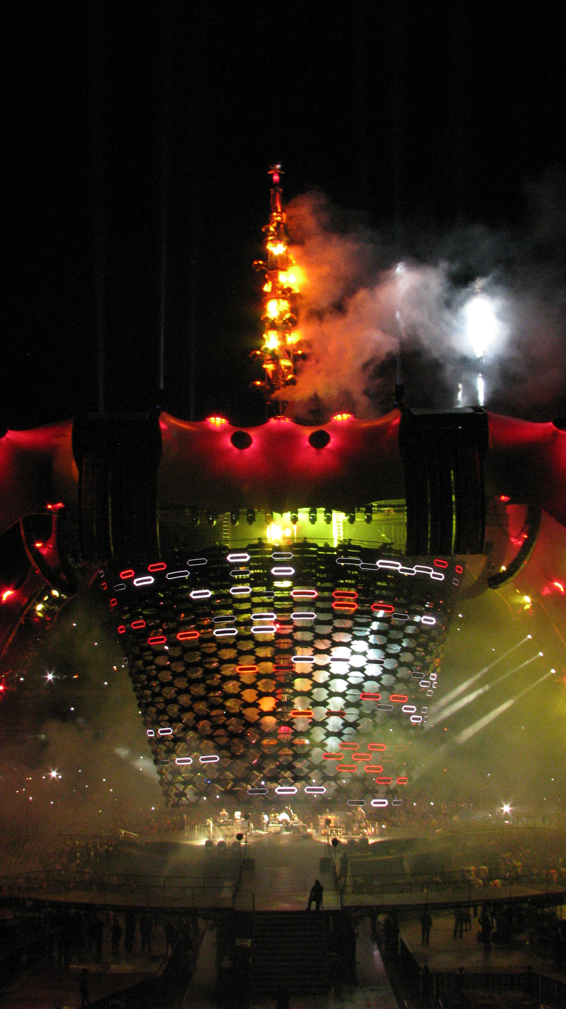 Algo muito interessante era a torre que iniciava poucos metros acima do palco e ultrapassava a cúpula da “garra”, como era denominada a forma da estrutura, criando nuances luminosas isoladas do restante do palco. Mesmo no espaço interior víamos claramente as luzes e fumaça criando um cenário grandioso desse conceito belíssimo.