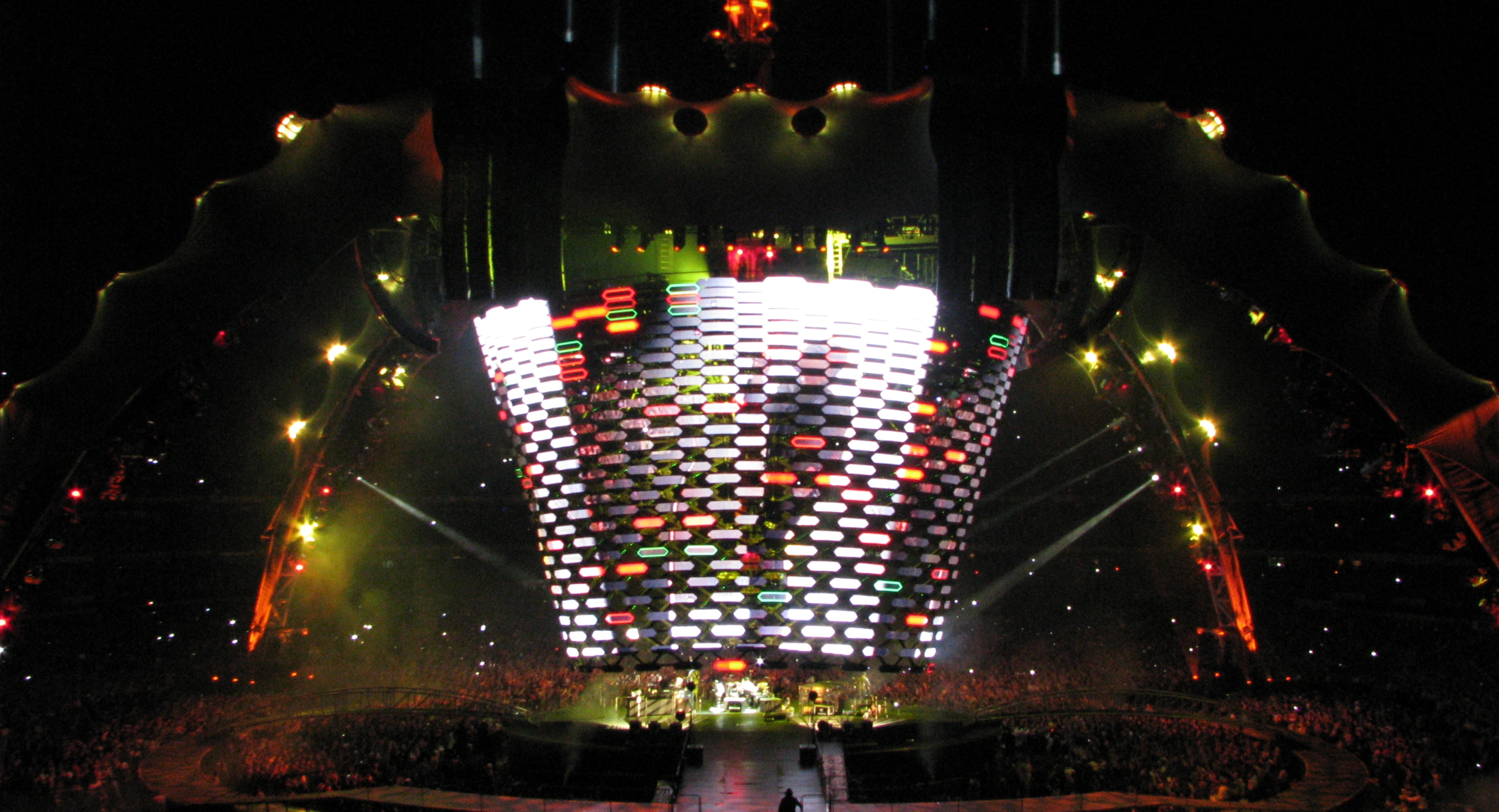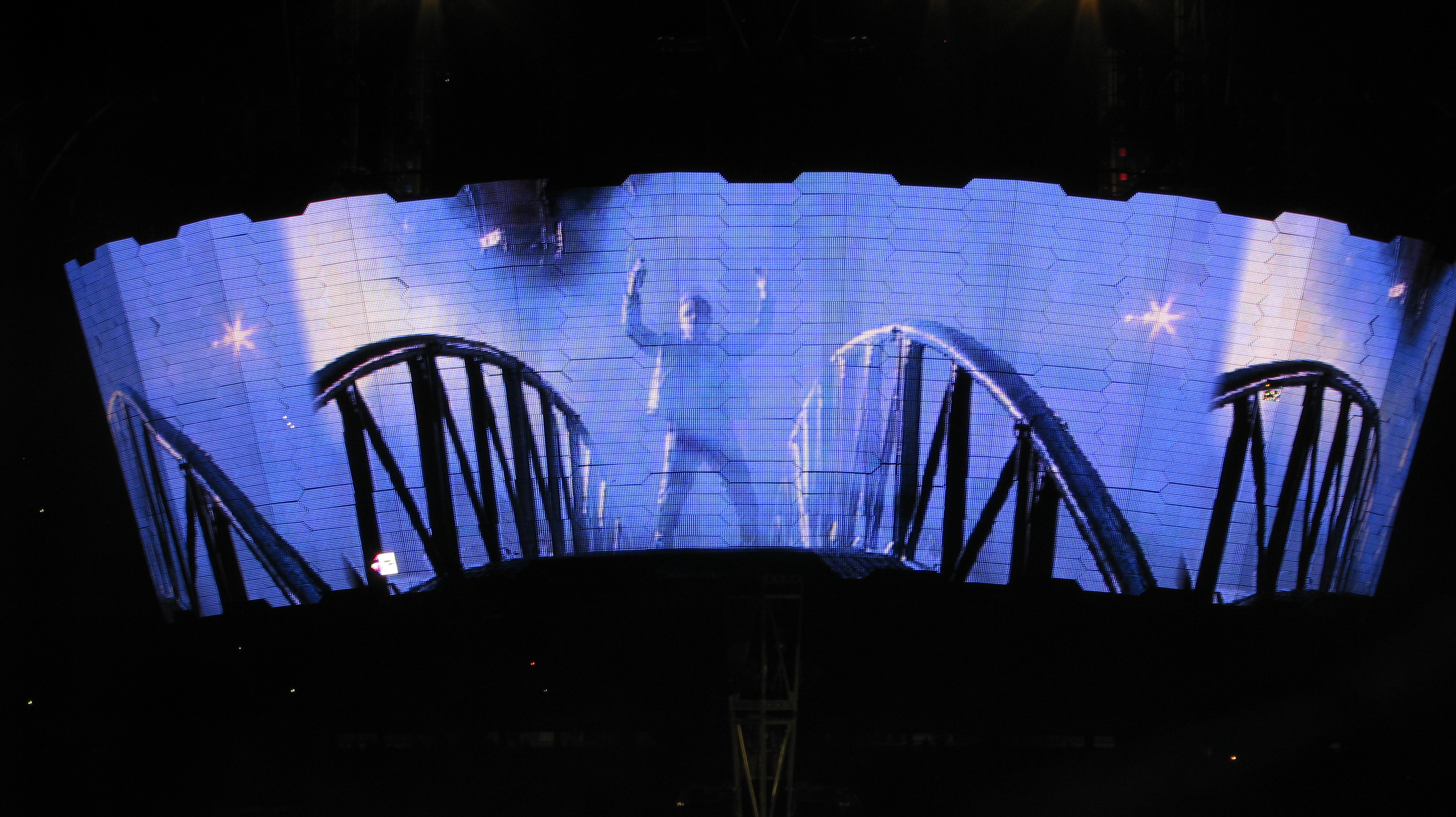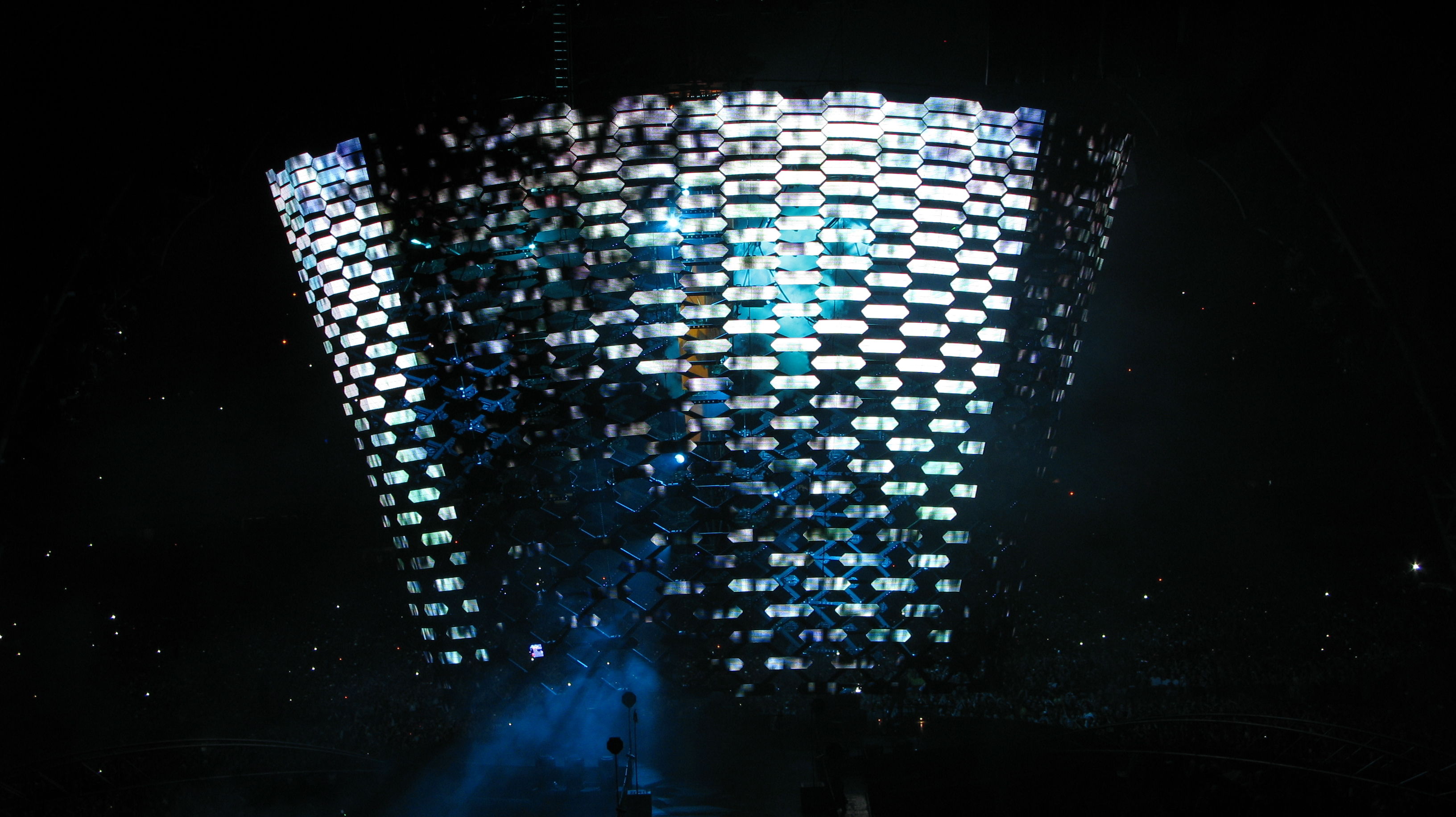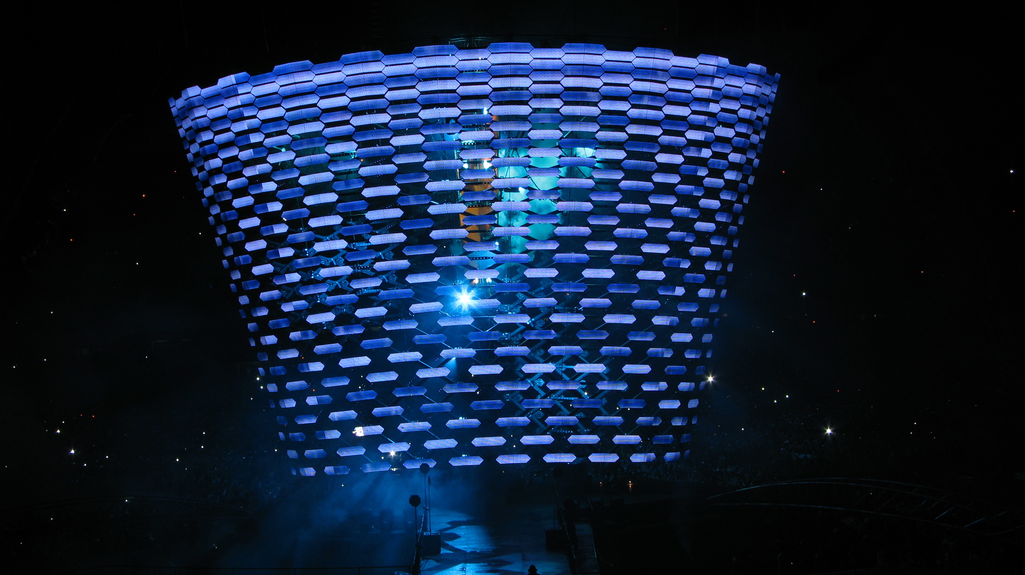 Algo muito interessante era a torre que iniciava poucos metros acima do palco e ultrapassava a cúpula da “garra”, como era denominada a forma da estrutura, criando nuances luminosas isoladas do restante do palco. Mesmo no espaço interior víamos claramente as luzes e fumaça criando um cenário grandioso desse conceito belíssimo.